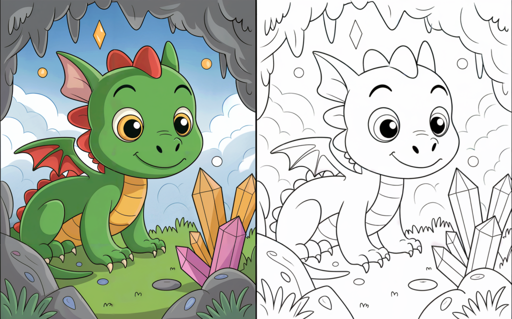 This sweet dragon is grinning in a enchanted cave covered in sparkling crystals. Kids can find pleasure in coloring the dragon’s big eyes and the vibrant pebbles surrounding it.