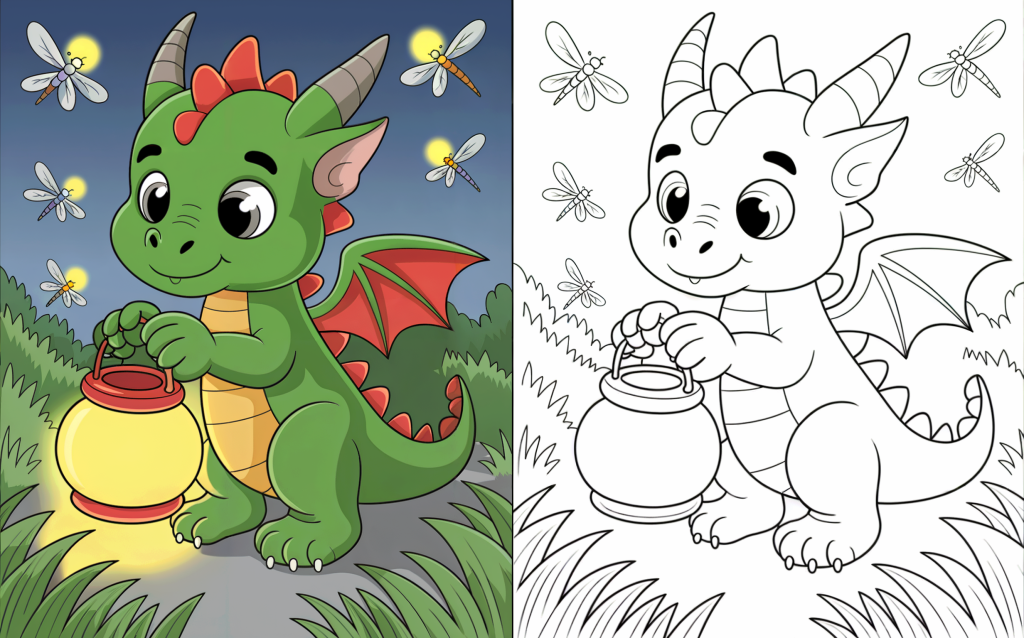 While investigating outdoors, a curious dragon carries a lantern. Kids might like coloring soft light and evening details.