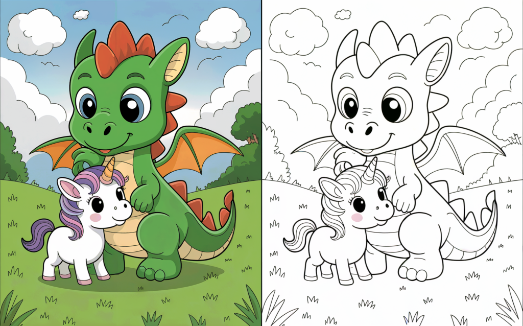 A gentle dragon hugs a beautiful unicorn buddy. This lovely coloring sheet encourages creativity and friendliness.