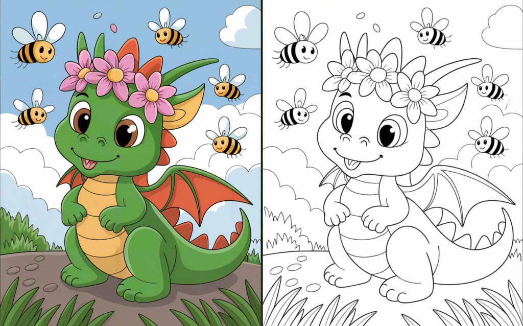 This adorable dragon wears a flower crown as friendly bees surround. Kids might delight in coloring wings, happy faces, and flowers.
