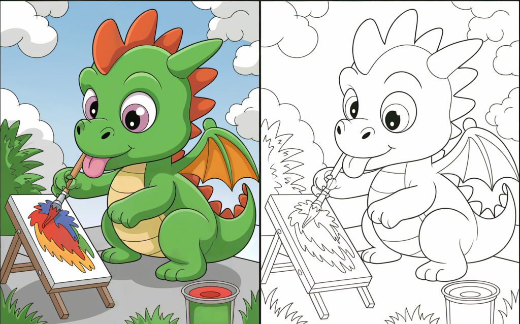With a brush and canvas, this imaginative dragon draws a picture. While recreating this amusing scene, kids can visualize brilliant artwork.