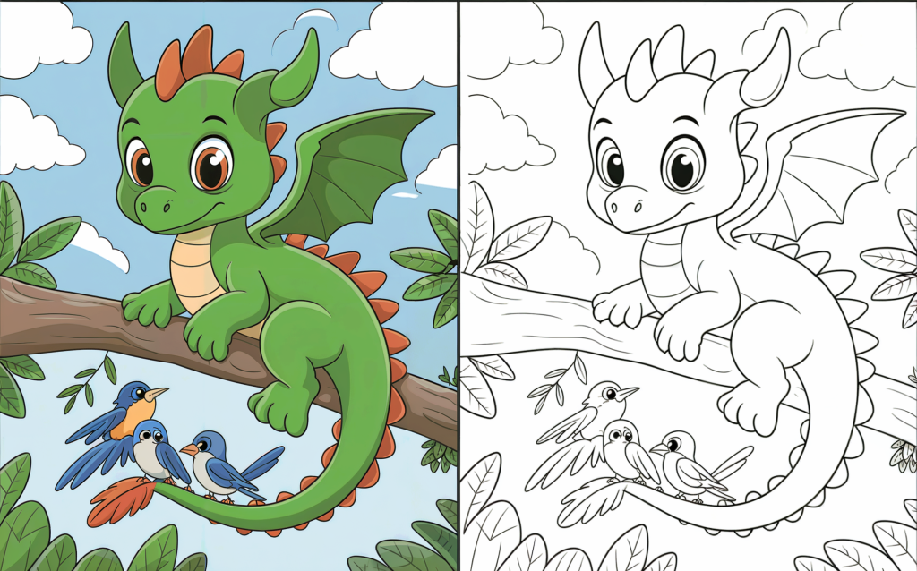 Tiny birds gather underneath as a gentle dragon sits on a tree limb. This calm scene lends itself to imaginative coloring and relaxing.