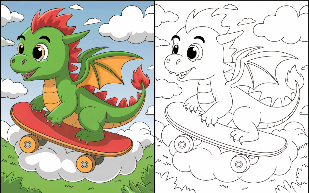 A lively dragon skates through soft clouds. This page includes a delightful action component into coloring hour.