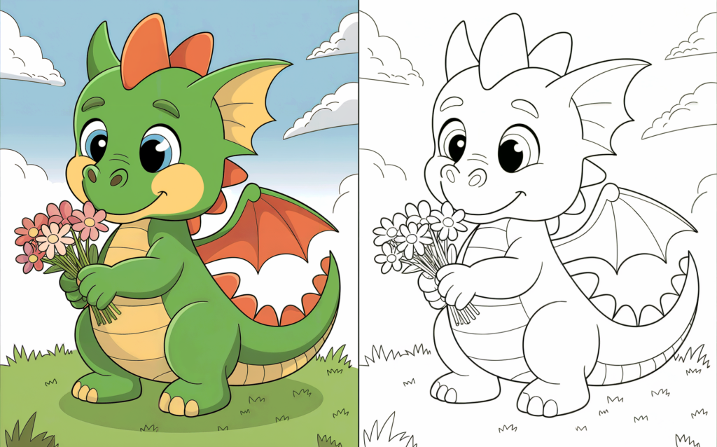 With a happy smile, this lovely dragon bears a bundle of flowers. Kids can use whatever colors they like to color the petals.