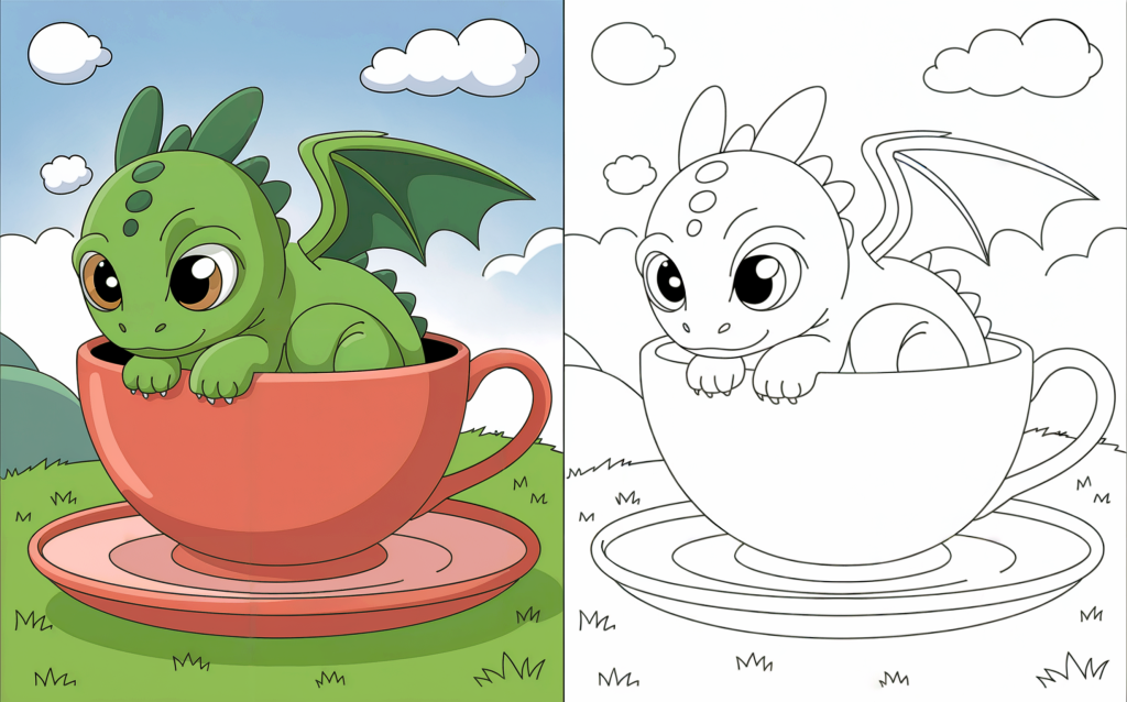 Within a teacup on a saucer rests a small dragon. For delicate coloring, this adorable and warm design is ideal.