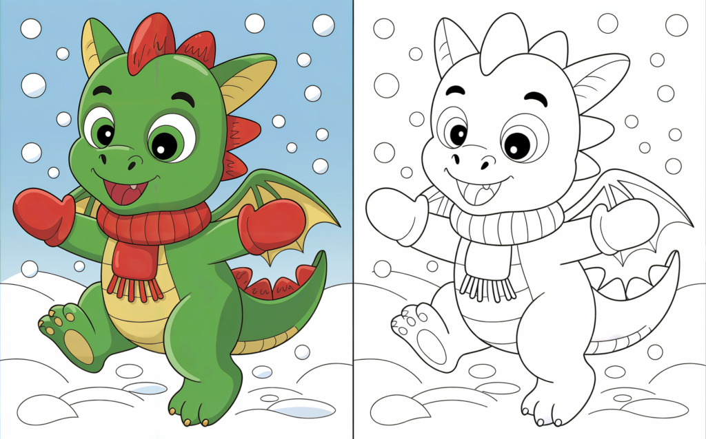 This cozy dragon is dressed for winter fun with a warm scarf. Kids can experiment with winter colors while enjoying the playful scene.