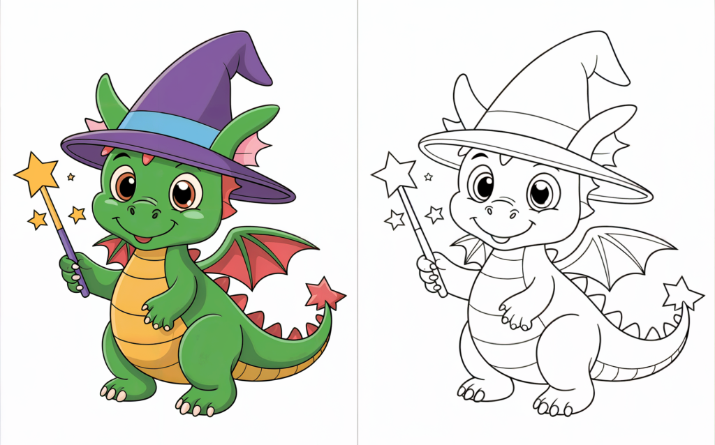 This dragon stands prepared with a magic wand dressed like a little wizard. Kids will enjoy coloring the hat, wand, and magical features.