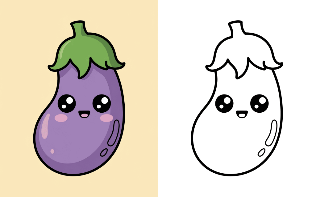 A smiling eggplant with large, bright eyes and a round tummy. Children adore coloring this one because it has a friendly appearance and a sleek form.