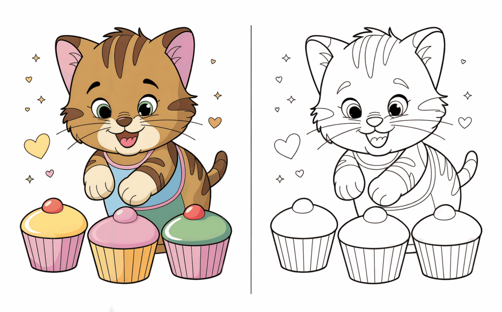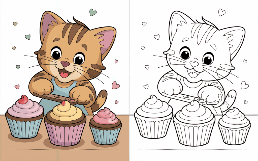 Smiling widely, this joyful cat is decorating delectable cupcakes. A delightful coloring page fusing adorable kittens with yummy sweets.