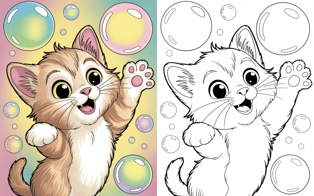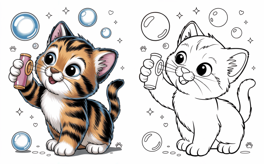 This happy kitten is enjoying blowing shimmering soap bubbles. A magical coloring page with bubbles, glitter, and whimsical appeal.