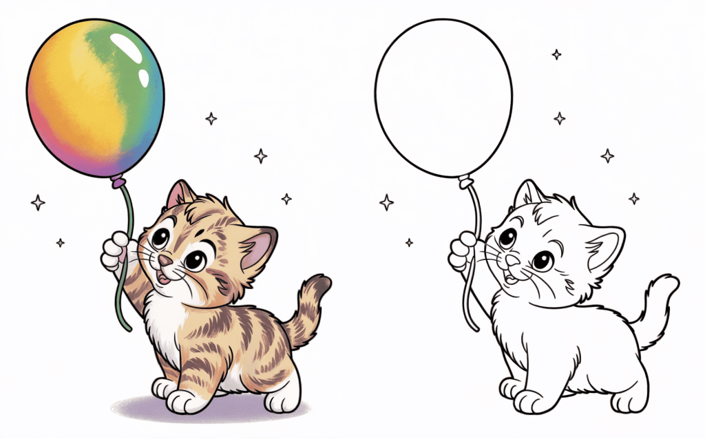 Holding a floating balloon, this playful kitten smiles up. Kids find coloring simple forms calming and easy.