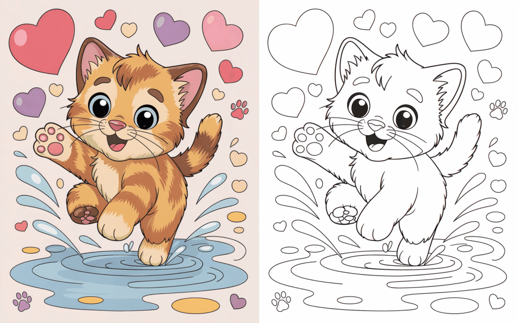 With great joy and excitement, this happy kitten is leaping toward a puddle. This page is excellent for fun coloring time with the splashing water and happy face.