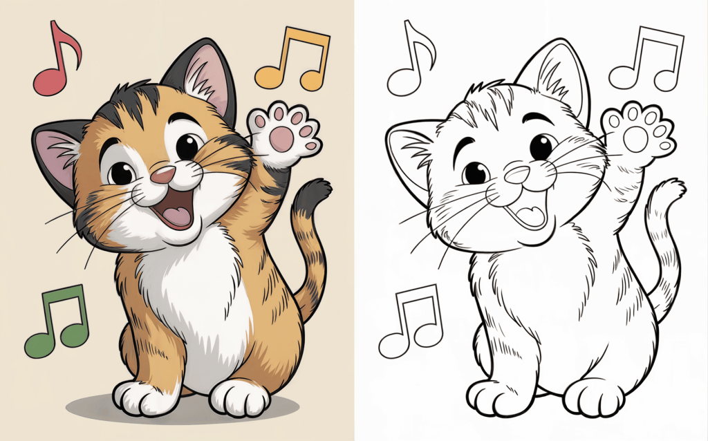 This happy kitten is dancing along to bright musical notes with a big smile. Kids will enjoy painting this dynamic scene full of entertainment and movement.