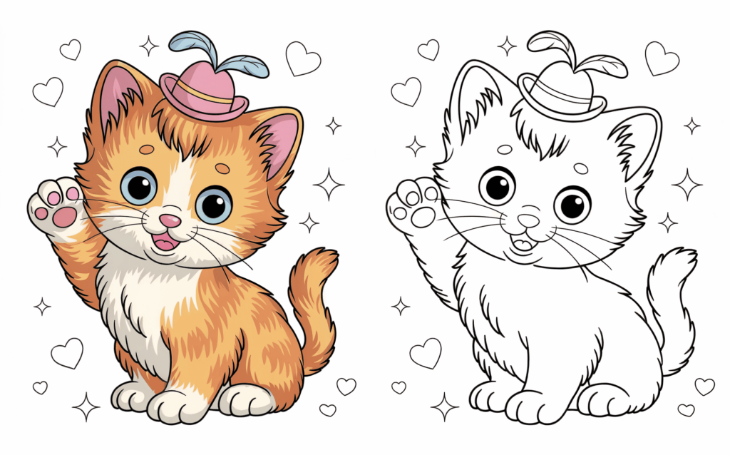 Wearing a tiny, adorable hat, this playful kitten waves cheerfully. It’s a happy page to color with stars all around.