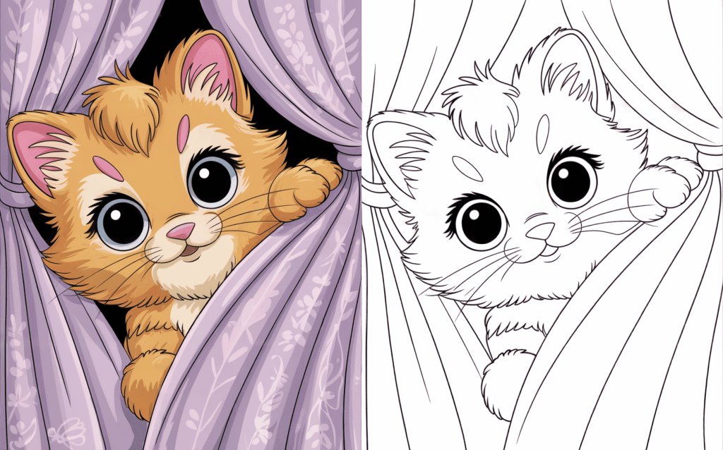 With big, kind eyes, this strange kitten peers through floppy curtains. A warm setting that draws in quiet and crafted coloring.