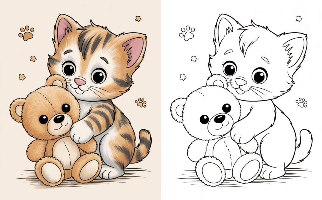 This lovely kitten wraps love around a soft teddy bear. Kids will delight in bringing to life this charming coloring page.