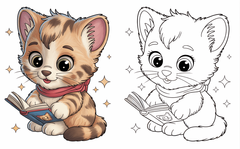 This adorable kitten is enjoying in story time with an opened book. An ideal coloring page to promote creativity and knowledge.