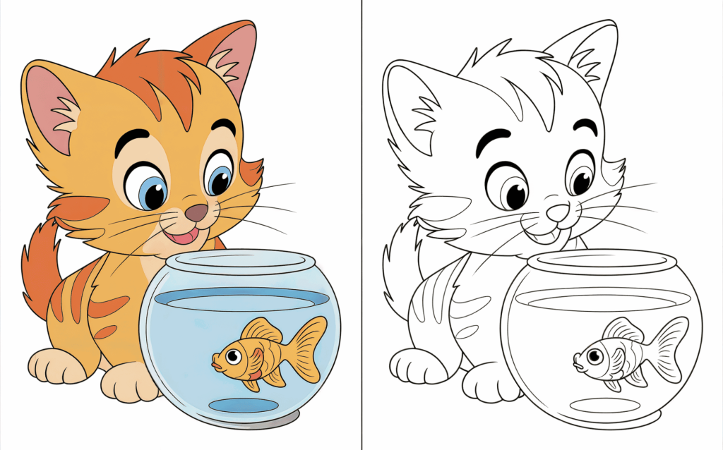 This happy kitten is trying to play with a fish in a small tank. This upbeat scene inspires kids to use vibrant, fun colors.