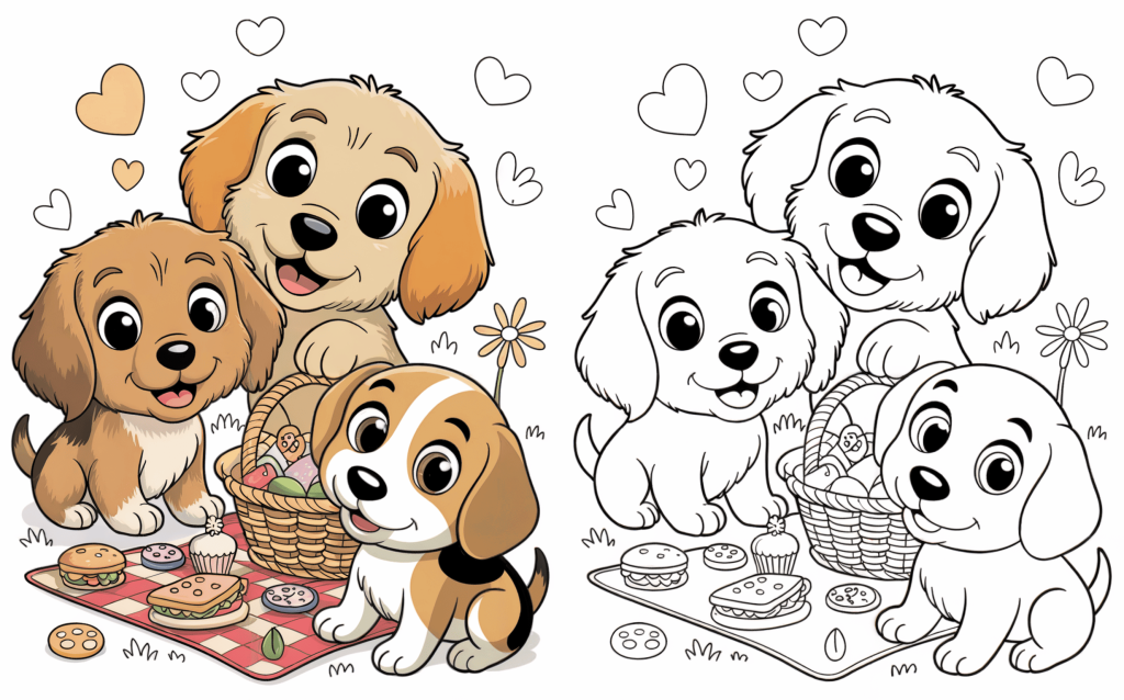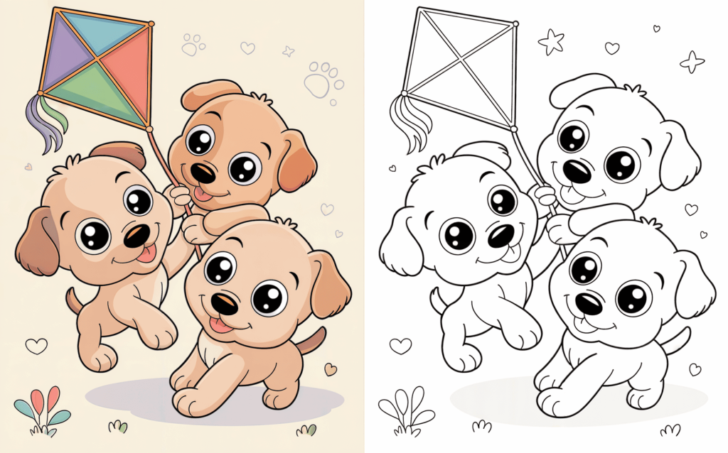 Three lively puppies fly a kite together, filled with excitement and movement. This energetic scene is ideal for practicing coloring big forms and whimsical details.