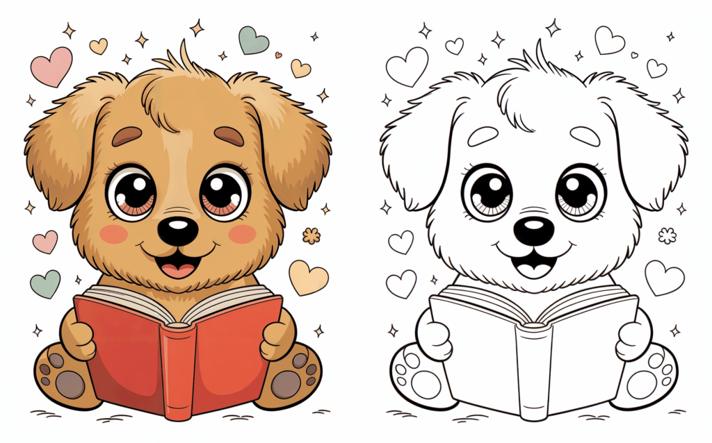 An adorable dog reading with a book. Quiet coloring sessions benefit from this relaxing page, which also fosters a reading habit.
