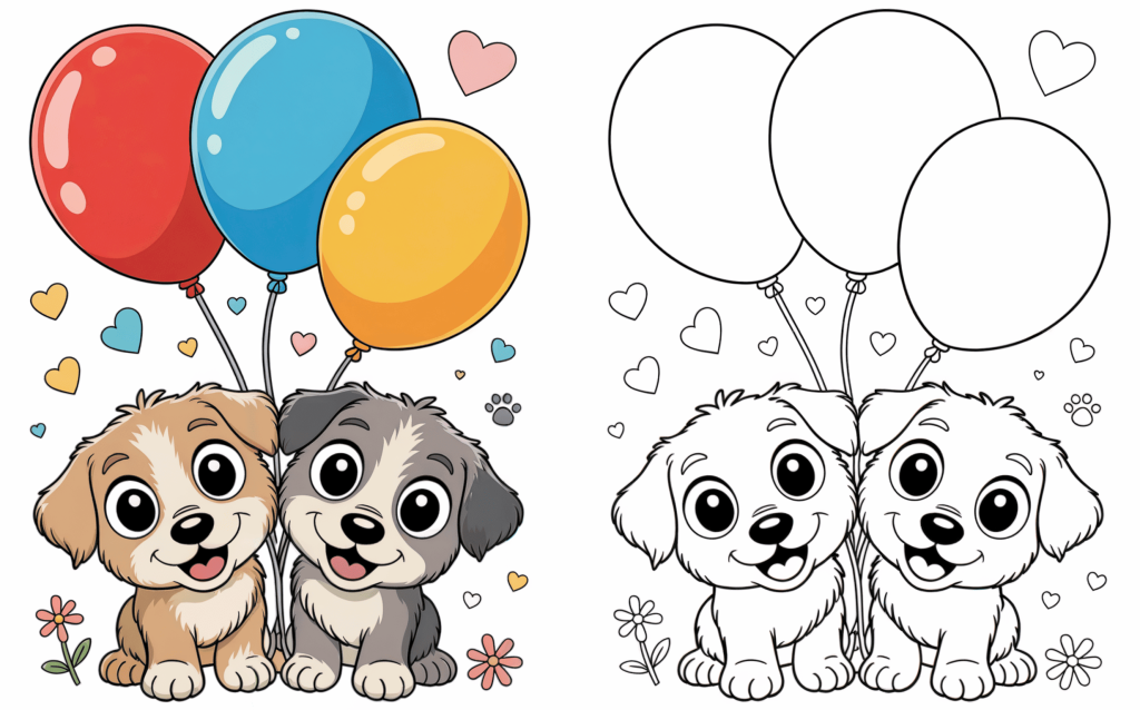 Two joyful puppies carry balloons while hearts drift about them. This upbeat scene inspires kids to use vibrant, fun colors.