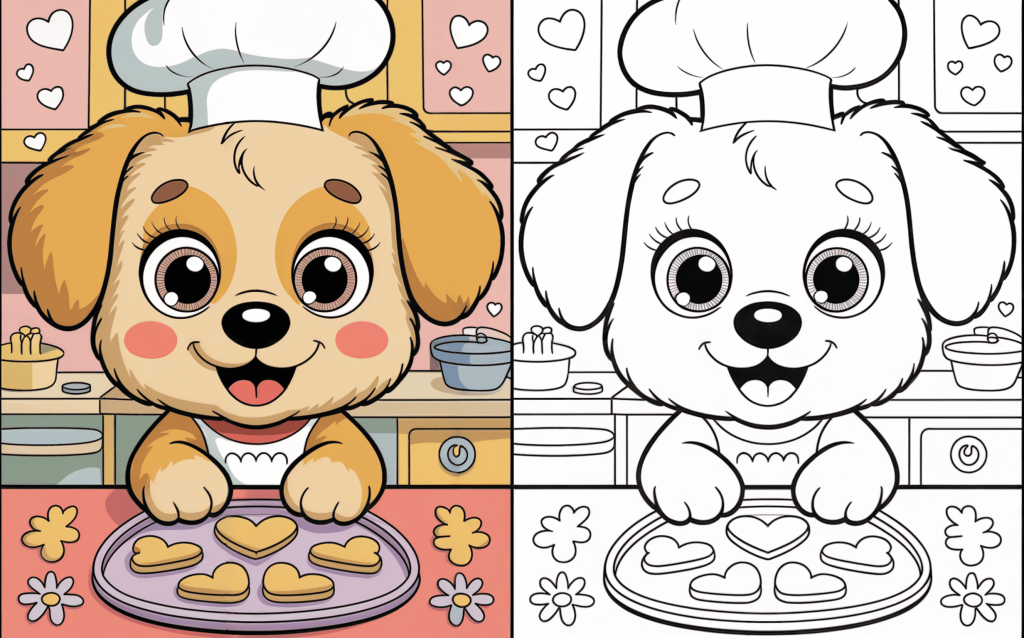 A lovely dog cooking heart-shaped cookies wearing a chef’s hat. This amusing page encourages imaginative play and creativity.