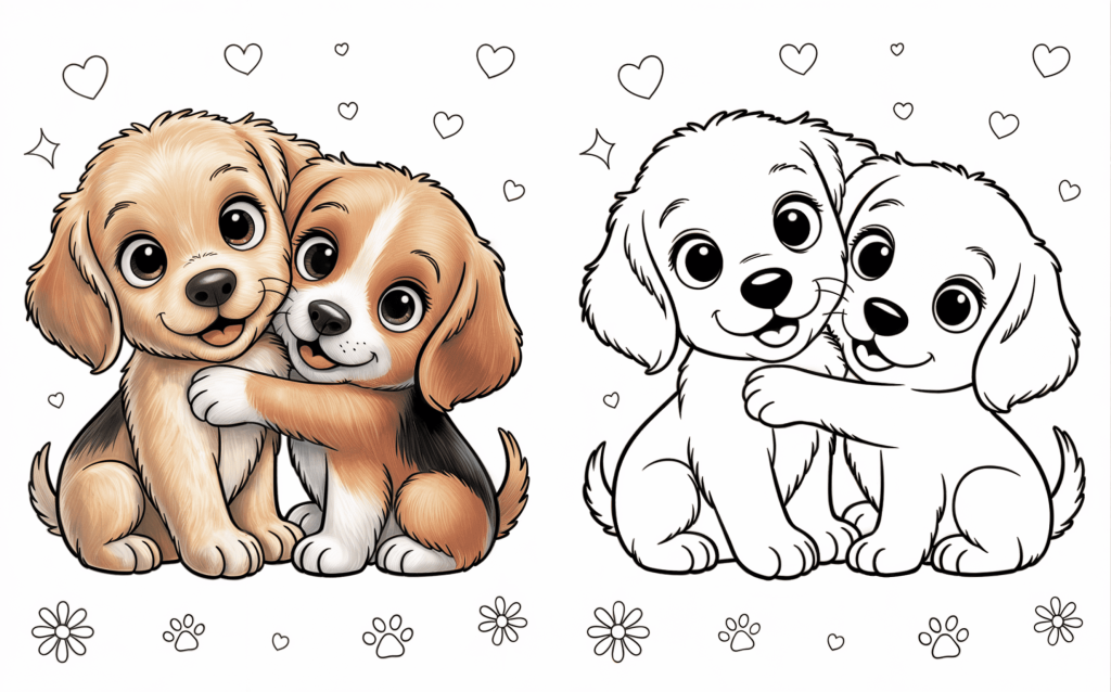 Two cute pups sitting near to one another, encircled by hearts, are featured on this charming coloring page. For coloring soft fur textures and expressing friendliness via warm hues, it is ideal.