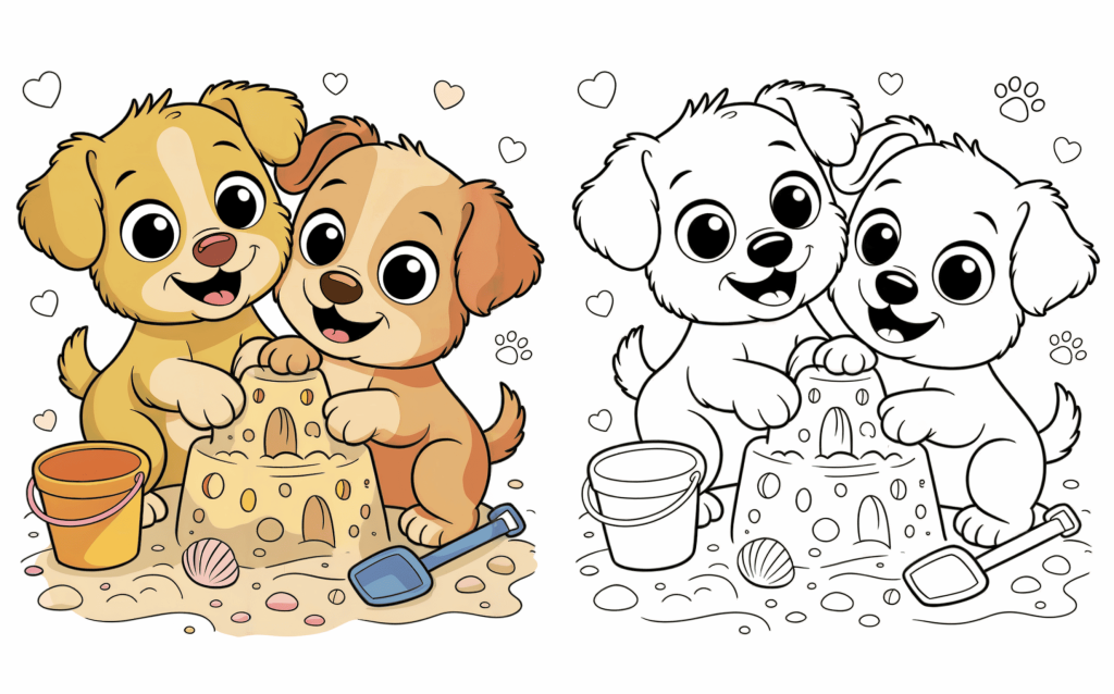 At the shore, two fun puppies construct a sandcastle with tools and pails. While dreaming of a pleasant puppy expedition, children may delight in coloring beach components.