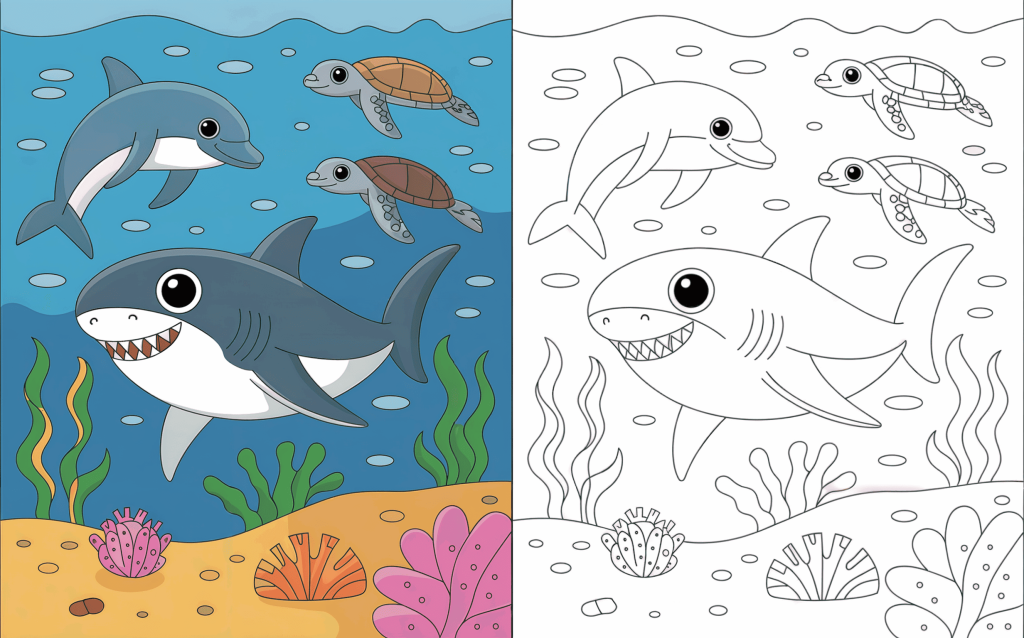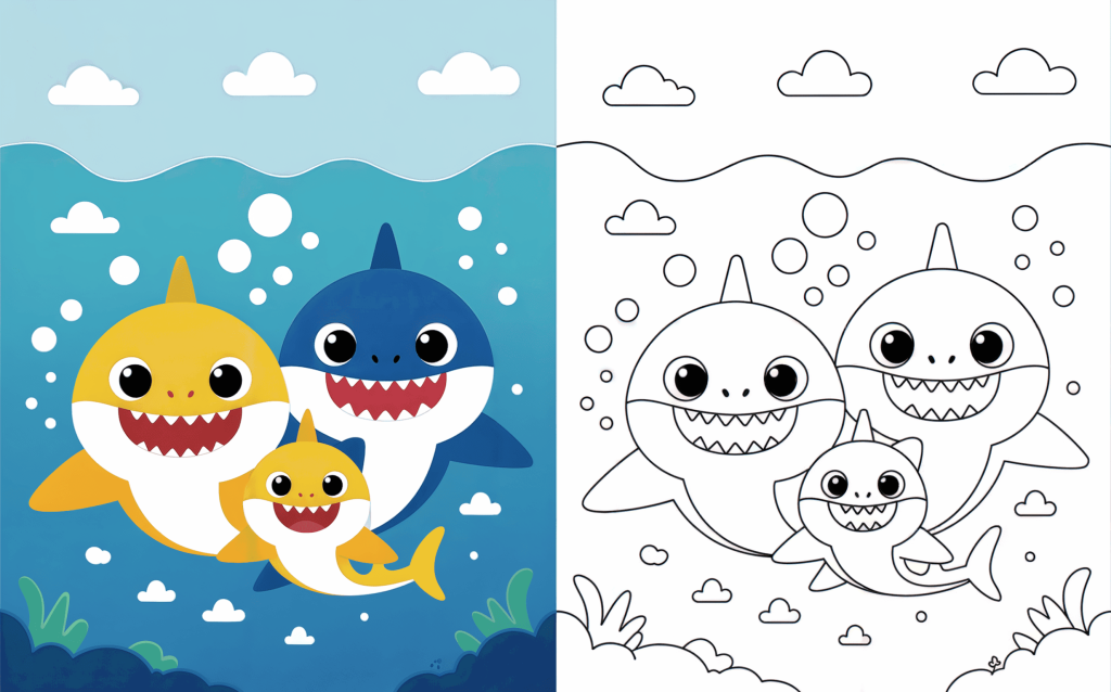 These cute sharks coloring pages improve fine artistic skills, hand-eye coordination, and focus in kids while engaging in an enjoyable, no-internet leisure activity. Coloring also promotes creativity patience, and inventiveness as children select colors and finish each image at their own pace. The included colored version of each page is particularly beneficial for younger youngsters since it offers a distinct color reference and boosts confidence. Parents can use the colored pages as a simple guide or even as a gift after coloring is completed. This helps kids feel proud of their work while learning color recognizing and visual understanding, therefore making the activity both educational and encouraging.