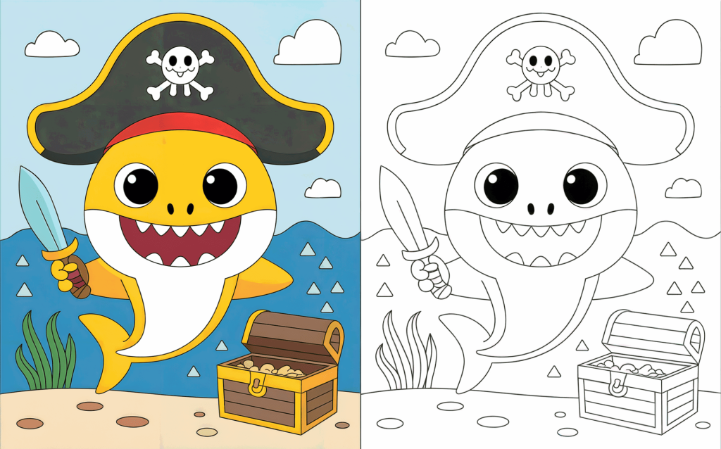 This brave shark is guarding a chest of riches wearing a pirate hat. Coloring allows kids to envision thrilling ocean adventures.