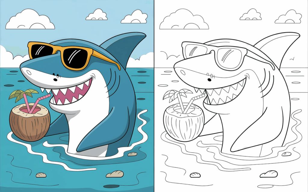 Stylish shark rests on the beach with sunglasses and a coconut beverage. Fun summer coloring sessions are ideally planned for on this page.