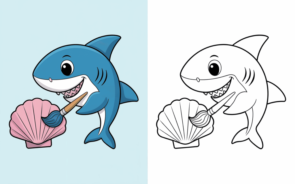 An imaginative shark paints a seashell using a brush. While maintaining a quiet and whimsical atmosphere, this page encourages imagination.