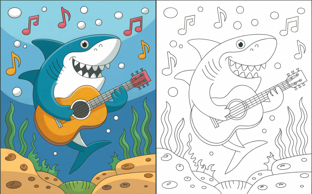Between notes and bubbles, this musical shark strums a guitar beneath the ocean. For kids who enjoy music and creative characters, this is a wonderful page.