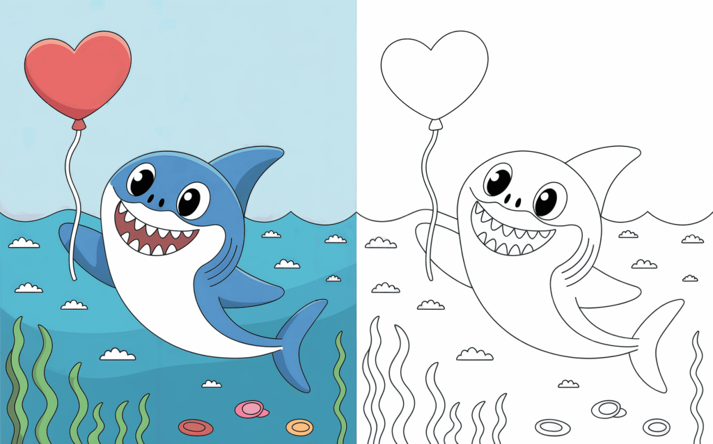 Sailing across the sea, a happy shark carries a heart-shaped balloon. For kids who adore lovely characters and happy features, this sweet scene is just ideal.