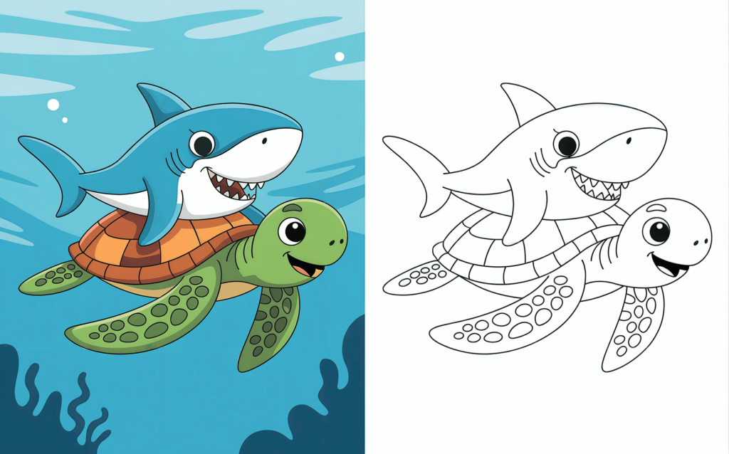 This fun coloring page shows a happy shark riding on the back of a turtle. Kids would love bringing this creative and entertaining design to life with color.