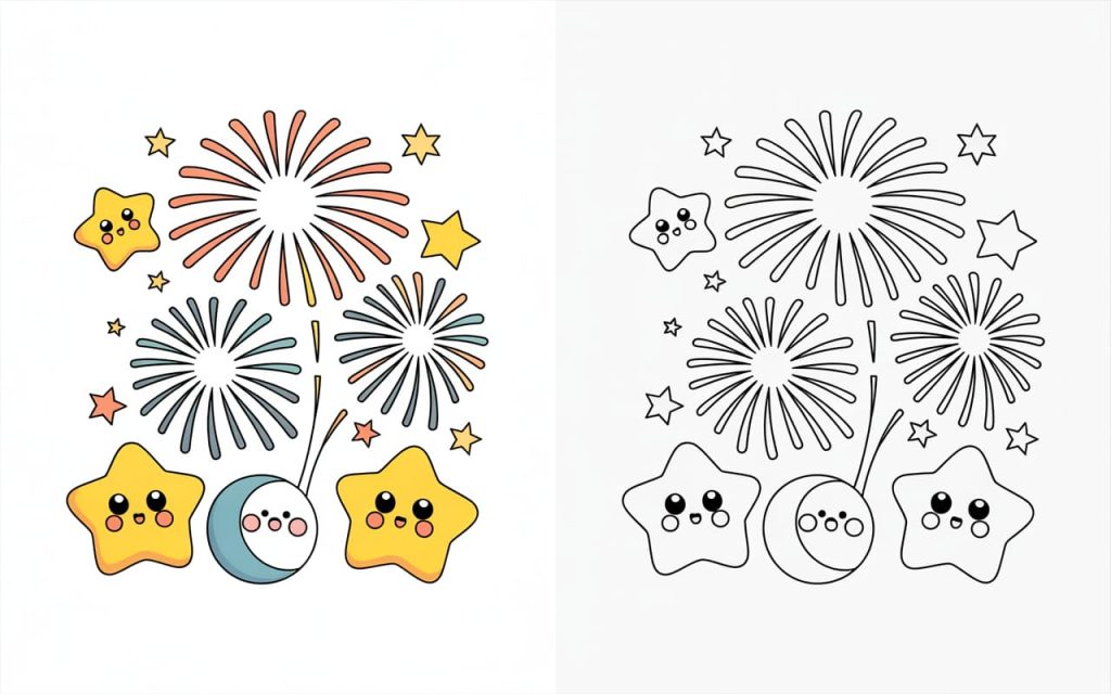 Star-shaped adorable fireworks spread across the heavens. An excellent page for honing brilliant patterns.