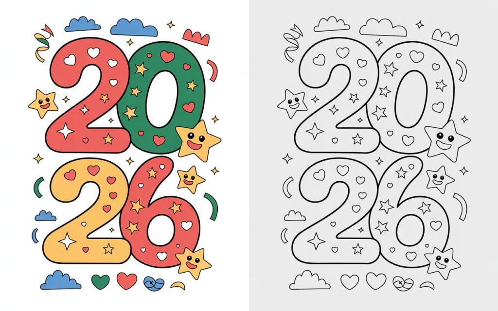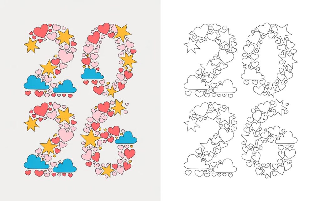 Hearts, stars, and clouds adorn the number 2026 on this lovely coloring page. This calming style invites kids to explore with hues and patterns.