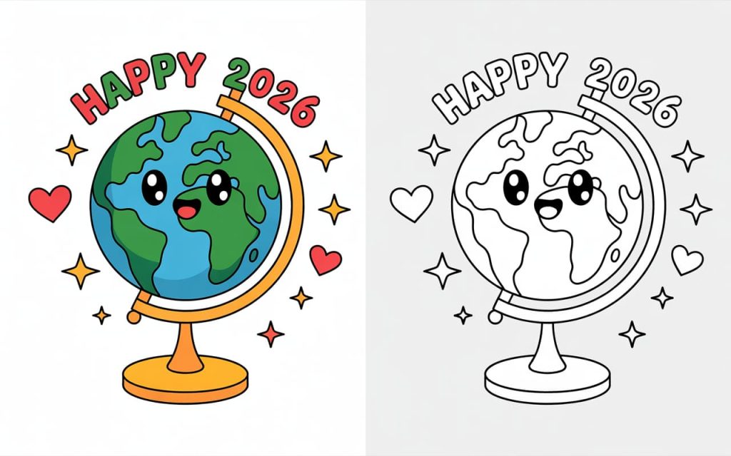 Heart and stars around a laughing globe usher in 2026. This page softly presents the concept of celebrating the New Year worldwide.