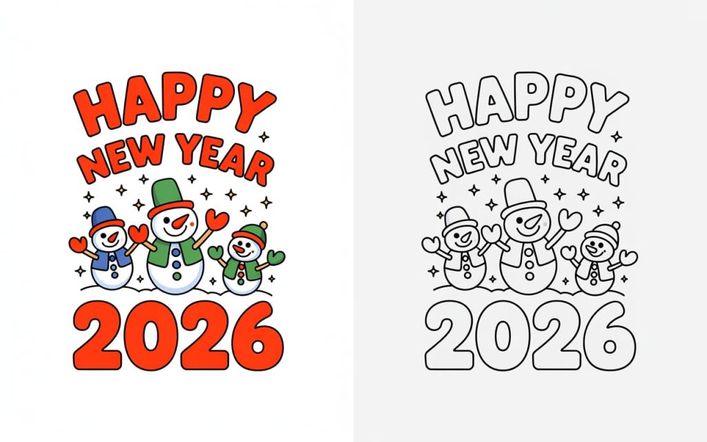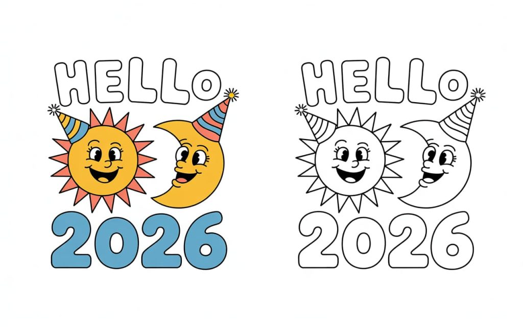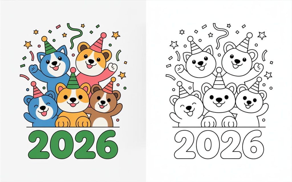 This celebratory coloring page has a striking “Happy New Year 2026” message among lively party characters. Kids can color stars, hats, and amusing decorations.