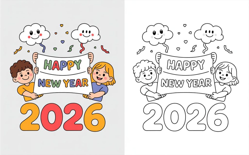 Smiling clouds help two happy kids hold a “Happy New Year 2026” sign. For family or classroom coloring time, this adorable page works wonderfully.