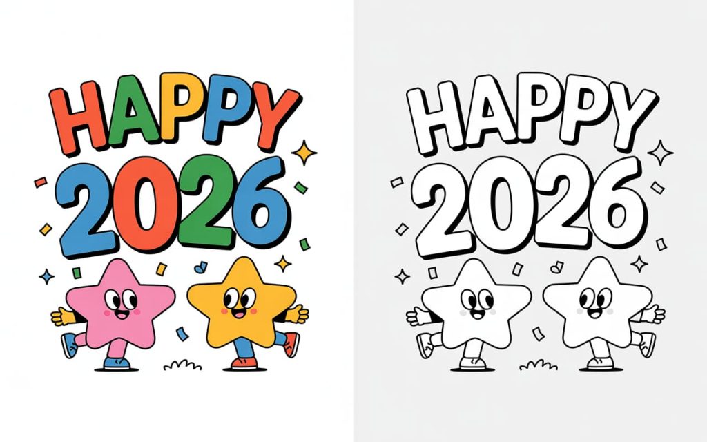 Under the striking words “Happy 2026,” two joyful star buddies celebrate. With vast open areas, this page is simple to color, entertaining, and bright.