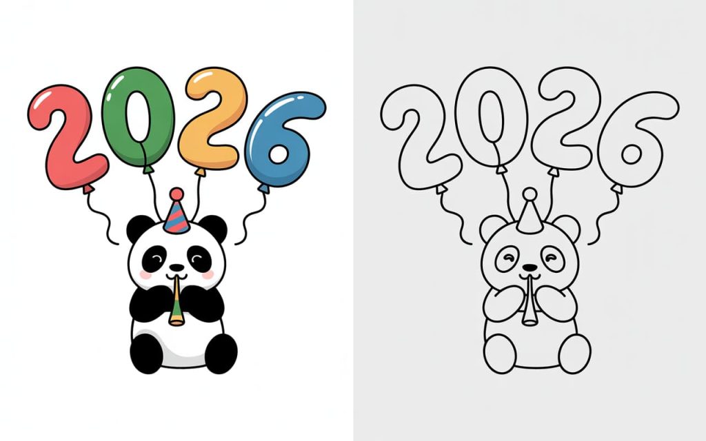 Celebrating with balloons styled as 2026, a playful panda blends numbers children adore with animals.