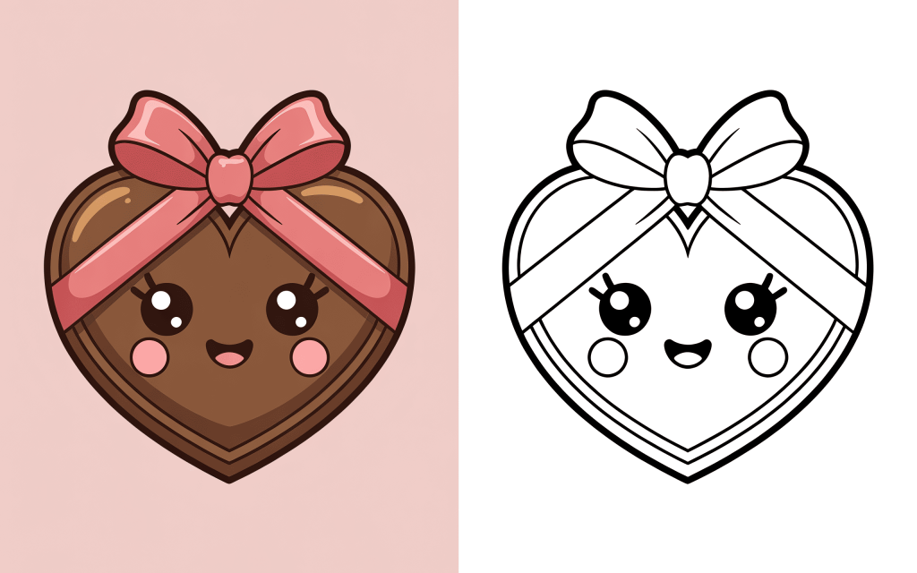 A joyful face on a Valentine chocolate box tied with a bow. This lovely design fits ending the coloring collection on a love-filled note.