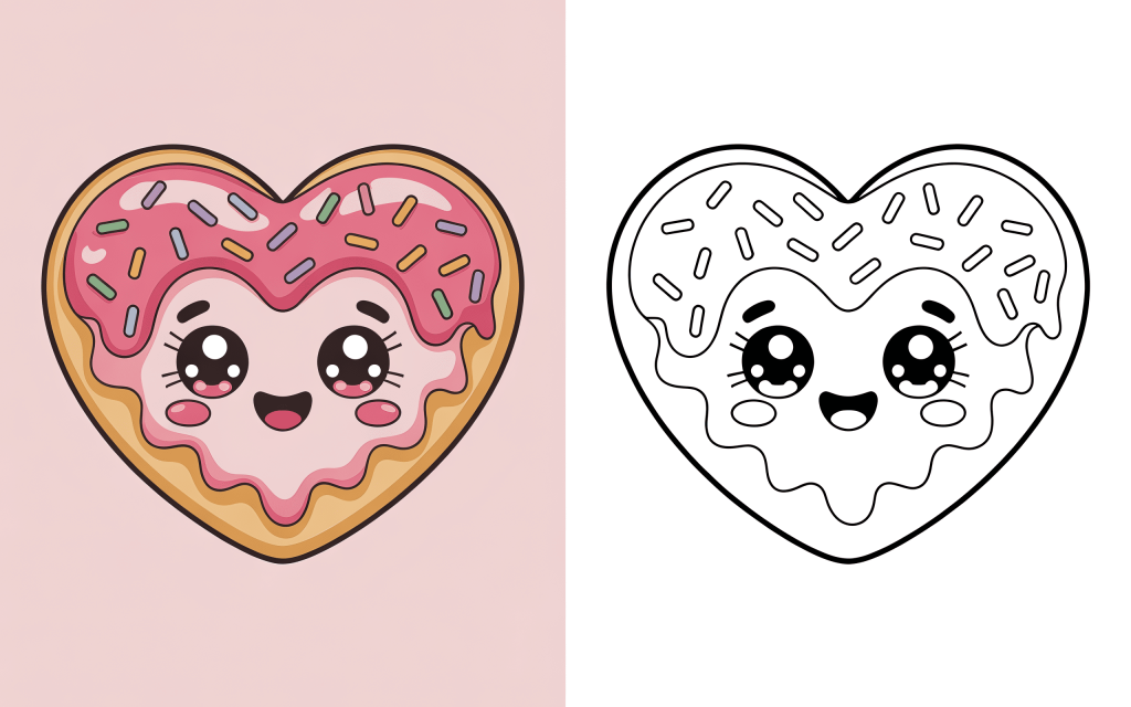 Sprinkle and smile-decorated sweet heart-shaped donut. Great for fun patterning and coloring practice.