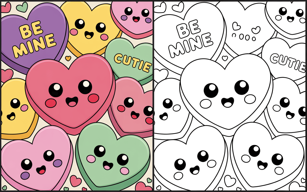 Classic Valentine candies with endearing faces and kind words. For pastel hues and color patterns practice, this page is excellent.