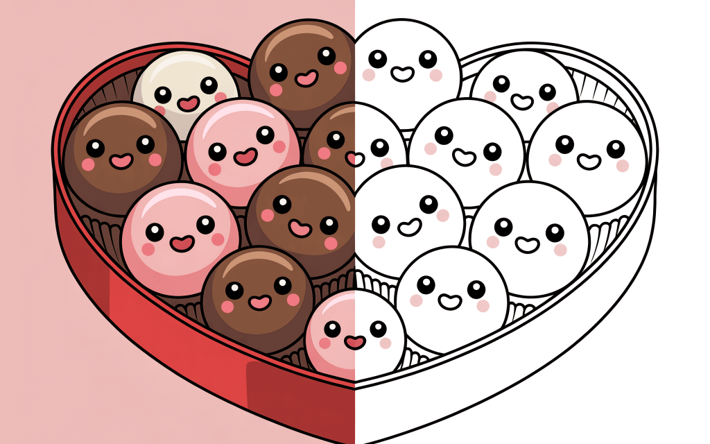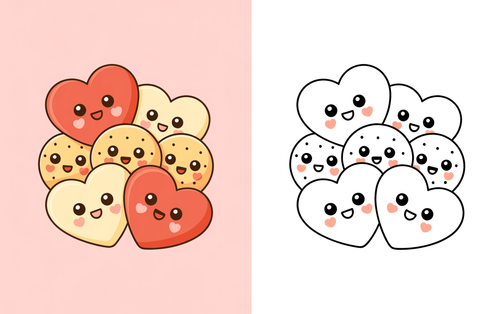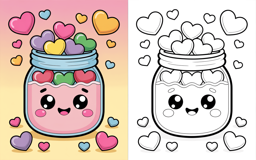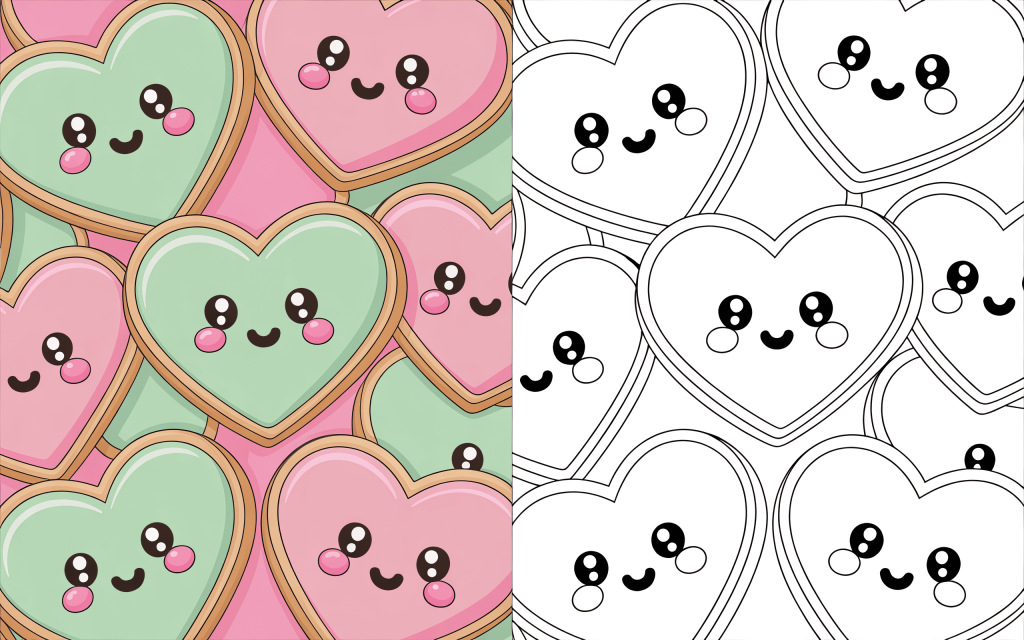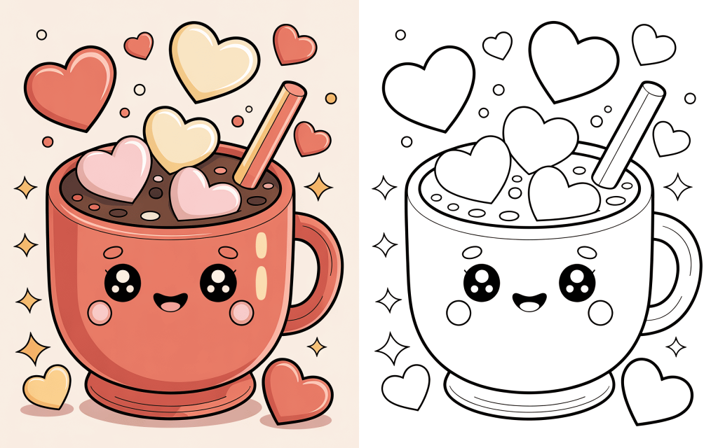 Our sweetest Valentine food coloring pages are made for you, ranging from heart-shaped snacks and warm beverages to cute desserts with smiling faces.