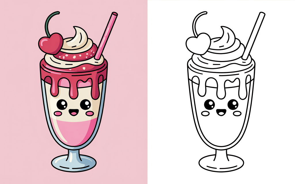 A tall Valentine milkshake featuring whipped cream, heart cherry, and swirling syrup. This page is great for trying out pinks, reds, and creamy pastel hues.