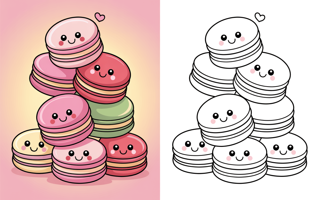 Macarons with rounded shapes and smiling faces stacked atop one another. Kids will enjoy selecting various colors for every macaron as they hone their precise coloring abilities.