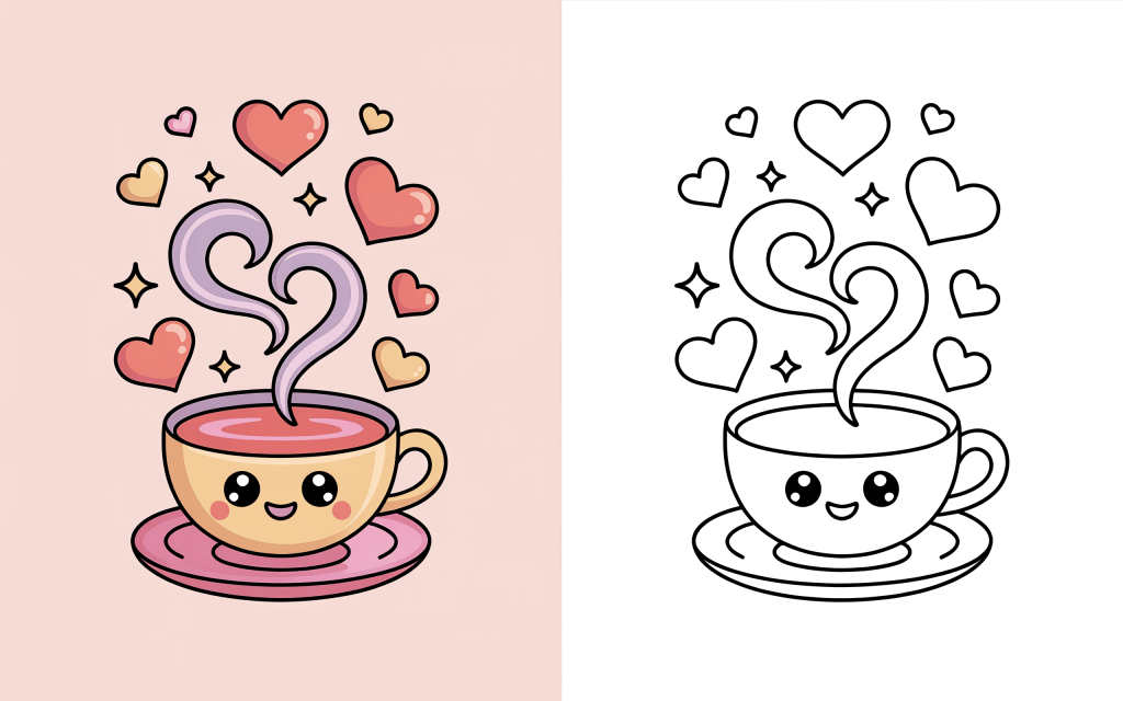 A hot coffee with heart-shaped steam drifting over. Cozy Valentine moods and relaxing coloring sessions call for this calming page.