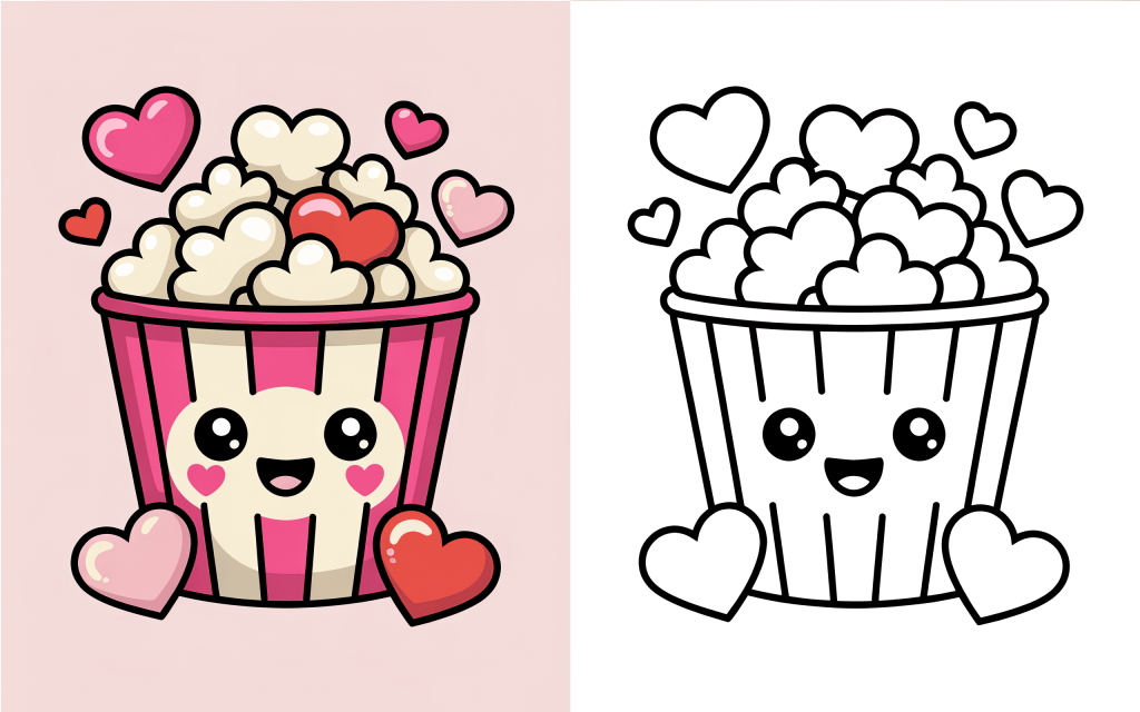 A adorable popcorn decorated with happy eyes and fluffy heart frosting. Young kids and new colorists will find it perfect thanks to its simple lines.